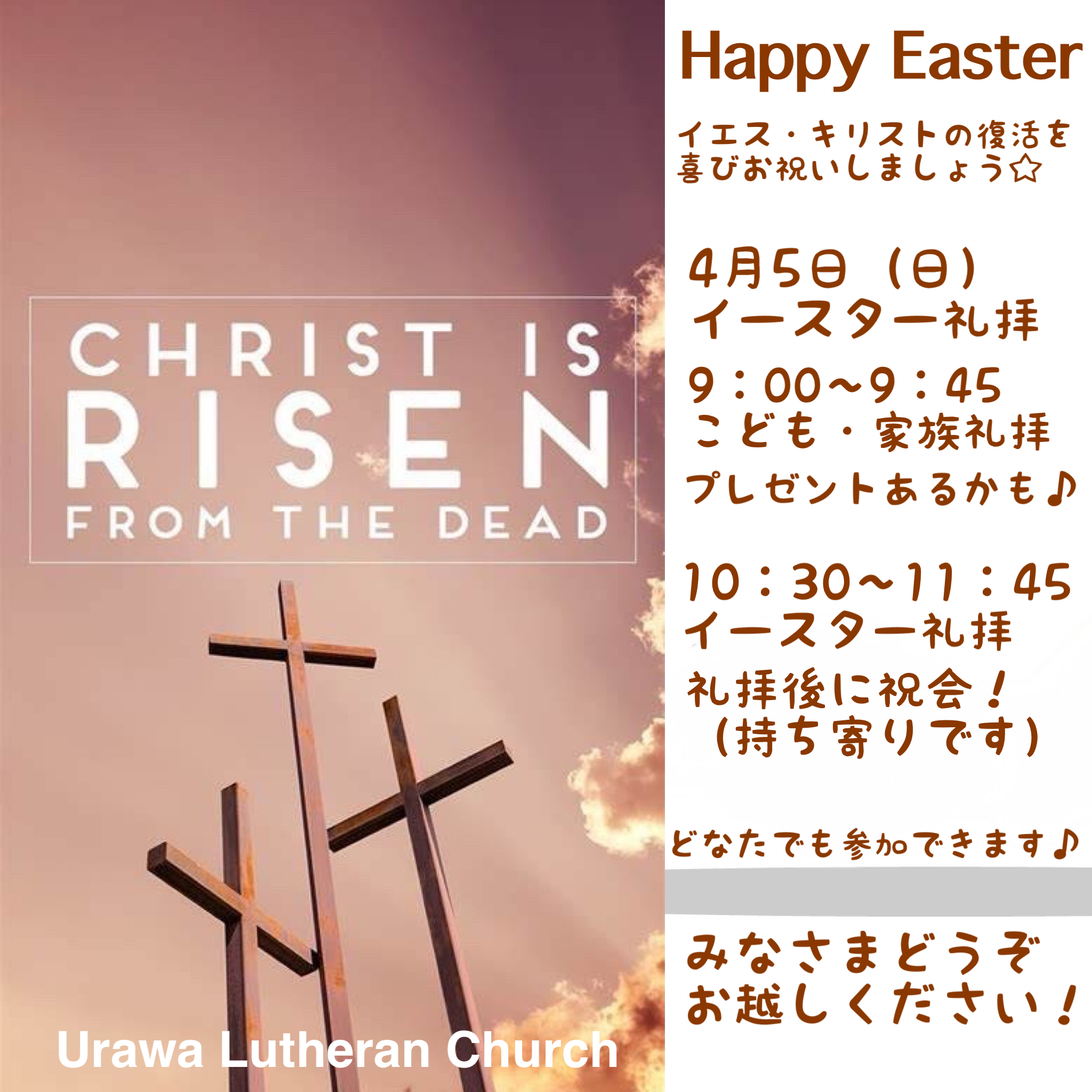 イースターだよ全員集合! みんなでキリストの復活をお祝いしましょう♪ 4月5日(日)9:00〜9:45 こどもと家族の礼拝 イースターのプレゼントがあるかも♪ 4月5日(日)10:30〜11:45 復活祭 イースター礼拝 キリストの復活を喜び祝います♪ 礼拝後、持ち寄りによる祝会をします♪ どなたでも大歓迎! 手ブラでOK 服装自由 献金自由 のぞいてみるだけでも大丈夫♪ 来て、見て、聞いて、受け取ってください、神さまの祝福を♪ どうぞお気軽にお越しください♪ ☆YouTubeに福音メッセージ動画アップしてます♪浦和ルーテル教会で検索してください☆